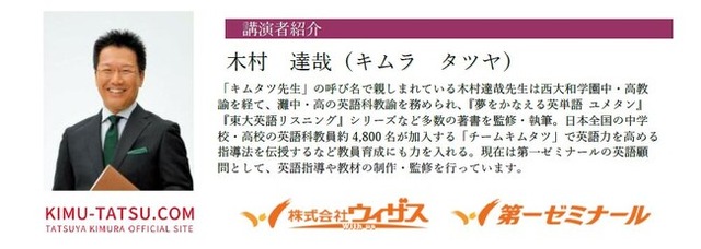 講演者の木村達哉さん(キムタツ先生)は、西大和学園中学校・高等学校にて10年。その後、灘中学校・高等学校において23年間英語の教師として従事し、東大・京大をはじめ国公立大学へ数多くの卒業生を送り出しました。現在は作家、第一ゼミナールの英語顧問として、2025年度から始まる新共通テストの英語事情や子どもの教育で大切にしていること、英語が使えるようになる学習法などを具体的にご紹介しています。