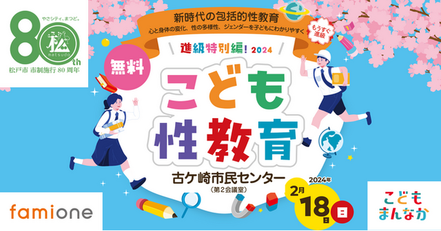 「子どもを願うすべての人によりそい 幸せな人生を歩める社会をつくる」をビジョンに掲げ、LINEを活用した妊活コンシェルジュサービス「famione (ファミワン)」 https://lp.famione.com/ を提供する株式会社ファミワン(本社:東京都渋谷区、代表取締役:石川勇介、以下当社)は、この度千葉県松戸市制施行80周年記念事業取り組みの一環として、「進級特別編!こども性教育2024」の運営の全てを担い、2月18日(日)に千葉県松戸市古ケ崎市民センターにて、現地開催することが決定いたしました。