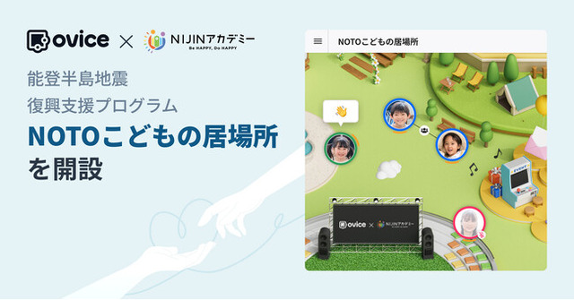 oVice株式会社(本社:石川県七尾市、代表取締役CEO:ジョン・セーヒョン)と株式会社NIJIN(本社:東京都江東区、代表取締役:星野達郎)は、「令和6年能登半島地震」の被害に遭った小学生・中学生を対象としたオンラインの空間「NOTOこどもの居場所」を2024年2月1日(木)に協働で開設します。「NOTOこどもの居場所」は、物理的に離れた場所にいても、みんながひとつの場所に集まり、一緒に会話や勉強ができるオンラインの居場所です。集団避難や2次避難によって物理的に離れ離れになっている友だちと集まる放課後の居場所や、学校が再開されない地域にお住まいの子どもたちの学習を支援する場所として活用いただくことを想定しています。