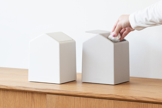 一般的なティッシュボックスを置く面積にMoiのティッシュケースとダストボックスの両方を並べることができます。2つセットで並べると「おうち」が2棟建ったようなかわいい見た目に。