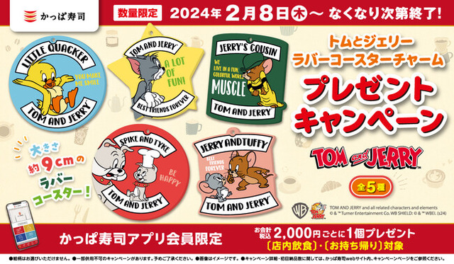 コロワイドグループのかっぱ寿司(カッパ・クリエイト(株) 本社:神奈川県横浜市、代表取締役:山角豪)は、ワーナー・ブラザースの人気コメディアニメ「トムとジェリー」とコラボレーションし、2024年2月8日(木)より、かっぱ寿司全店にて公式アプリ会員限定のプレゼントキャンペーンを実施いたします。