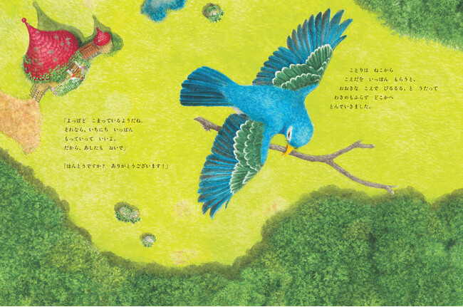 ・美しくて奥行きのある絵本。「絵がきれいで好き」「猫と小鳥の交流が温かい」から、「この猫の枝を束ねる仕事って、どういう仕事なのかな?」や「人間社会を表しているのかな?」などたくさんの方が感じたことを聞けました。知ってもらいたい、そして、読まれた方とこの絵本のことをもっと話したいと思った本です。(こどもの本のみせ ともだち 湯阪美智子)