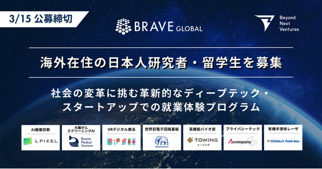 Beyond Next Ventures株式会社(本社:東京都中央区、代表取締役社長:伊藤毅)と株式会社tayo(本社:神奈川県横浜市、代表取締役:熊谷 洋平)は、ディープテック・スタートアップ創業支援プログラム「BRAVE GLOBAL」において開催される「就業体験プログラム」の公募を開始いたしました。本プログラムに参加を希望する海外在住の研究者・留学生の方は、公式ページよりエントリーをお願いいたします。