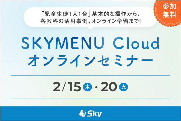 実際の授業を想定した活用シーンに合わせて「SKYMENU Cloud」の操作をご体験いただけるセミナーです。操作方法や活用場面などに関するご質問も承りますので、ぜひお気軽に「SKYMENU Cloud」をご体験ください。