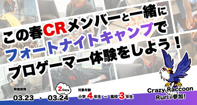 『CR Gaming School』が運営するesportsのプロゲーマー体験キャンプ『CR Fortnite CAMP』は、プロゲーマーを擬似体験できる点が特徴で、Crazy Raccoonのメンバーや豪華特別ゲストからの直接指導やさまざまな企画を通して、成功体験を味わえるプログラムとなっています。