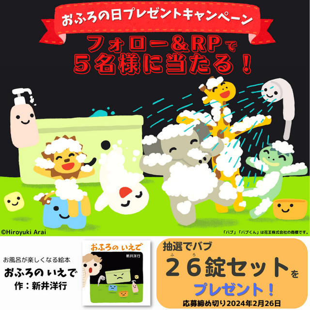 絵本『おふろの いえで』おふろの日プレゼントキャンペーンを開催中です。