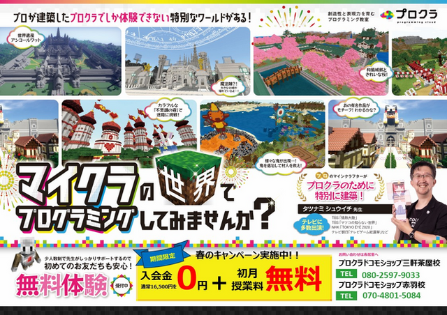 ドコモショップ赤羽校、ドコモショップ三軒茶屋校では実際にマインクラフトの世界でプログラミングの楽しさを体感いただける体験教室を毎週末実施しています。