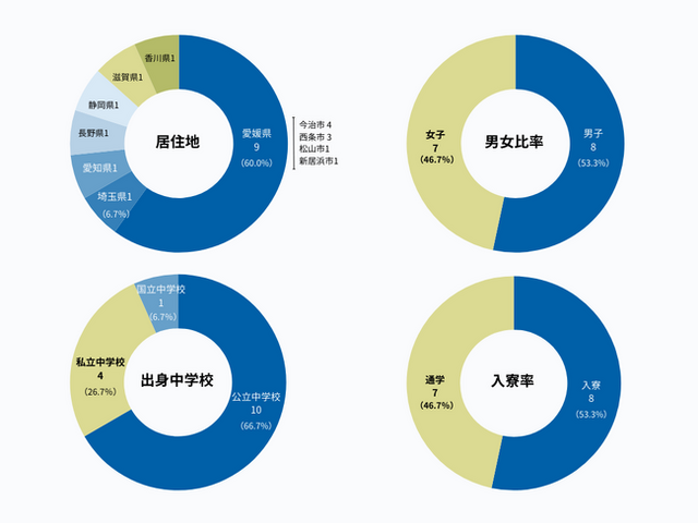 15名のうち愛媛県が最も多く9名、その他は埼玉県、愛知県、静岡県、長野県、滋賀県、香川県からそれぞれ1名と、全国各地より生徒が集まりました。