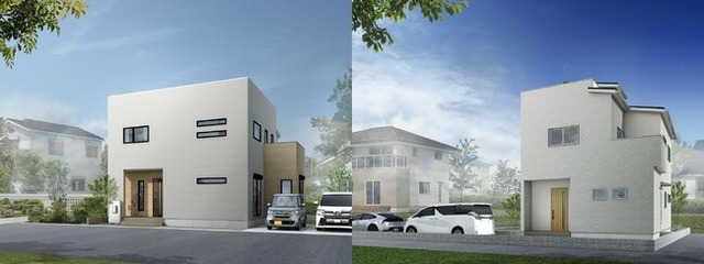 「ハートフルビレッジ高畑ランプタウン」の新モデルハウスは、キューブを組み合わせたような特徴的な外観と、コンクリート打ちっぱなし風の外壁が印象的です。