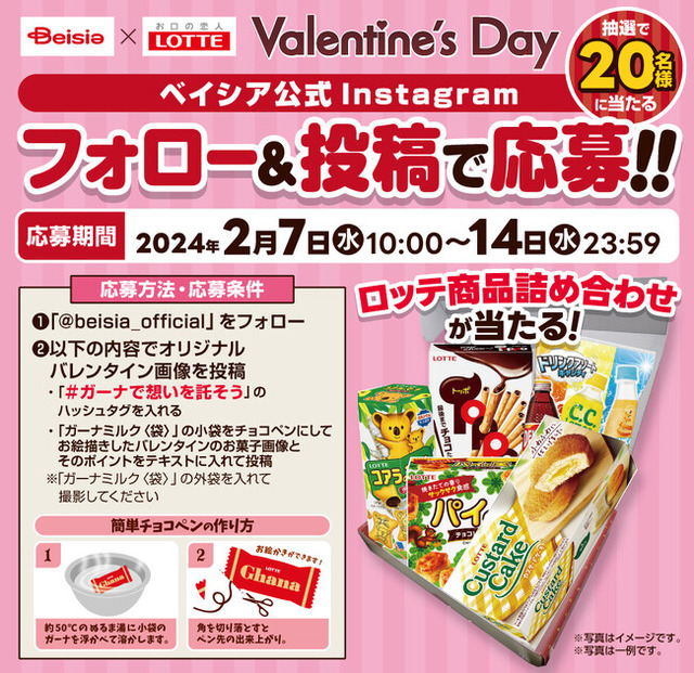 株式会社ベイシア(本社:群馬県前橋市、代表取締役社長:相木孝仁)は、株式会社ロッテ(本社:東京都新宿区、代表取締役社長執行役員:牛膓 栄一、以下「ロッテ」)との共同企画で、2月7日(水)から2月14日(水)の期間に、ベイシア公式Instagramにおいて「ロッテ×ベイシア Instagramフォロー&投稿キャンペーン」を実施いたします。ベイシア公式Instagramをフォローし、キャンペーン投稿に「#ガーナで想いを託そう」を付けて画像を投稿いただいた方の中から抽選で20名様に「ロッテ商品詰め合わせ」をプレゼントいたします。たくさんのご応募お待ちしております。