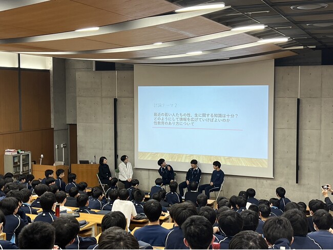 2回目の授業では、初回の授業後に生徒から寄せられた質問に善方先生が回答したのち、「男性に求められる行動とは? 生理の話題をタブー視する現状」「若い人たちの性、生に関する知識は十分なのか。性教育のあり方」という2つのテーマについて、代表の生徒6名とディスカッションしました。