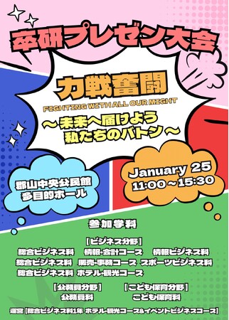 今年のテーマは、「力戦奮闘 ~未来へつなげ私たちのバトン~」 専門学校生活での学び、成長、困難や挫折を思い返して、今回のプレゼン大会に臨んでほしい。8回目を迎え、ここまで続いた「卒研プレゼン大会」のバトンを来年・・再来年・・の未来への繋いでいきたいという思いから、企画運営の総合ビジネス科1年ホテル・観光コースとイベントビジネスコースの学生が考えました。