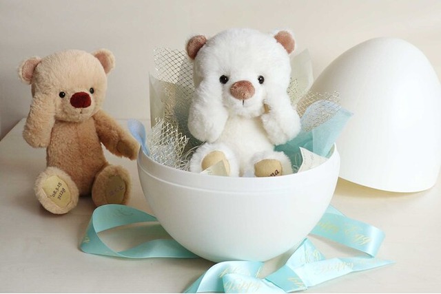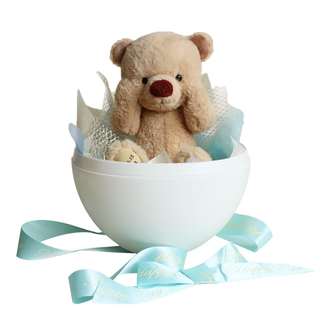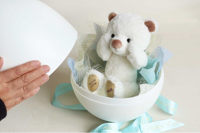 高さ30cmの大きなたまご型ボックスに包まれたかわいいテディベアが、新しい家族の誕生をお祝いします。