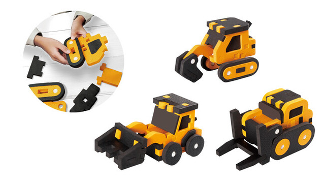 特徴:やわらか素材の組立ブロックで遊ぼう!EVA素材でできた、はたらく建設車3種類「ショベルカー・フォークリフト・ブルドーザー」をかっこよく組み立てられるかな?アームを動かして遊んだり、アレンジをしてみたり。遊びながら手先の感覚や集中力を養う知育玩具が登場。