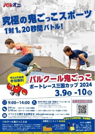 BOAT RACE三国で開催される「パルクール鬼ごっこボートレース三国カップ2024 」では、「あそびがカラダを作る!」をテーマに、パルクール鬼ごっこで楽しさとともに能力を向上させる、小学生以下及びその保護者を対象とした限定のイベントを3月9日(土)・10日(日)で2日間に渡り開催!