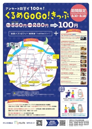 令和6年2月10日(土)~12日(月祝)の期間中、通常550円の「くるめGoGoきっぷ」を100円で購入できるキャンペーンを行います。