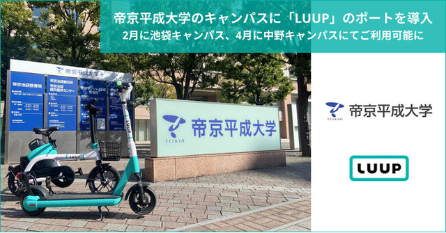 株式会社Luup(本社:東京都千代田区、代表取締役社長兼CEO:岡井大輝、以下「Luup」)は、学校法人帝京平成大学(所在地:東京都豊島区東池袋2丁目51−4、理事長:冲永佳史)が運営する帝京平成大学 池袋キャンパスおよび中野キャンパスに電動マイクロモビリティのシェアリングサービス「LUUP(ループ)」のポートを導入し、それぞれ2024年2月13日(火)、4月1日(月)※予定 より利用可能となることをお知らせします。なお、都内における私立の総合大学へのポートの導入は今回が初となります。