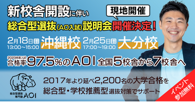 沖縄校は2月18日(日)、大分校は2月25日(日)に開催。高校生とその保護者が対象。大学入試の総合型選抜(旧AO入試)の対策塾「総合型選抜専門塾AOI」(以下AOI)を運営する株式会社花形(京都府京都市、代表取締役:小澤 忠、以下当社)株式会社花形は、ディック学園(大分県大分市、代表取締役社長:赤嶺 一夫)とともに大分校および沖縄校を2024年3月1日(金)に開校いたします。