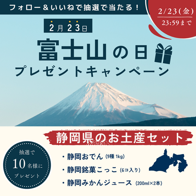ヨシケイの発祥の地「静岡」を代表する富士山のように、日本中でますます親しみ・愛されるよう2月23日の富士山の日に合わせ「富士山の日プレゼントキャンペーン」を実施します。ヨシケイ公式Instagramアカウントを「フォロー&いいね」するだけで、抽選で10名様に「静岡県のお土産セット」をプレゼント。沢山のご応募お待ちしております。