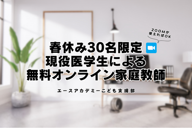 冬休みに引き続き、春休みのこどもたちへ教育支援を届けます。小中学生は誰でも無料で医学生から勉強を教わることができるプロジェクトです。詳しくは以下のボタンから「エースアカデミー こども支援部」の公式ホームページをご覧ください。