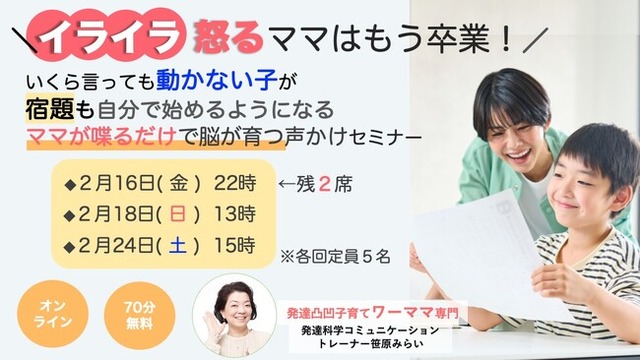 この度は、発達特性があって声かけしても行動が進まない子どもにイライラして怒ってしまうワーママが、怒らなくても子どもが自主的に行動できるようになる声かけについてお伝えするセミナーを開催いたします。
