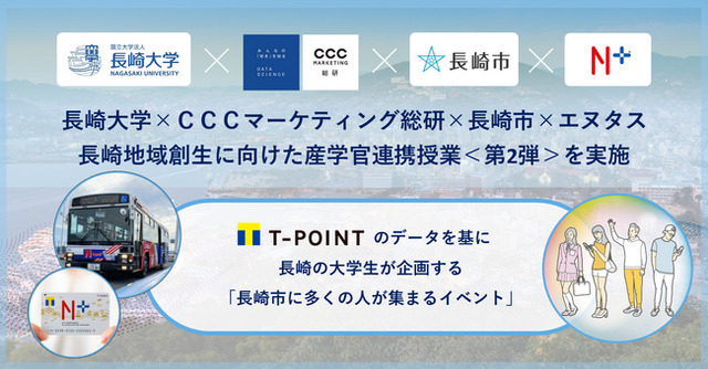 2022年より開始した産学官連携授業では、長崎大学 情報データ科学部にてデータマイニング・観光政策・観光ビッグデータを専門分野とする一藤裕准教授の講義「社会・観光情報学I」を受講する学生が、統計加工化したTポイントの購買データに加え、地域ICカード「エヌタスTカード」における長崎バスの乗降に関わる統計加工データを基に、地域創生に向けた企画提案をする取り組みです。