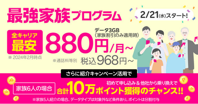 楽天モバイル株式会社(以下 「楽天モバイル」)は、2024年2月21日(水)より、同一名字のご家族であれば「Rakuten最強プラン」を月々100円(税込110円)おトクにご利用いただける「最強家族プログラム」(以下 「本プログラム」)を提供開始します(注1、2)。本プログラムにより、「Rakuten最強プラン」を、複雑な条件なしで、家族割引適用後3GB 利用時のプランで全キャリア最安値となる、月額880円(税込968円)で、ご契約期間中は料金の変動なくご利用いただけます(注3)。