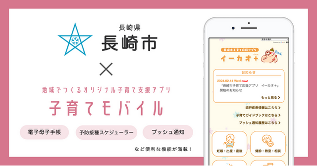 自治体向けサービスを開発する株式会社ミラボ(本社:東京都千代田区、代表取締役:谷川一也、以下「ミラボ」)の子育て支援アプリ「子育てモバイル」が、長崎県 長崎市に導入され、「長崎市子育て応援アプリ イーカオ+(プラス)」として2月14日より提供を開始します。