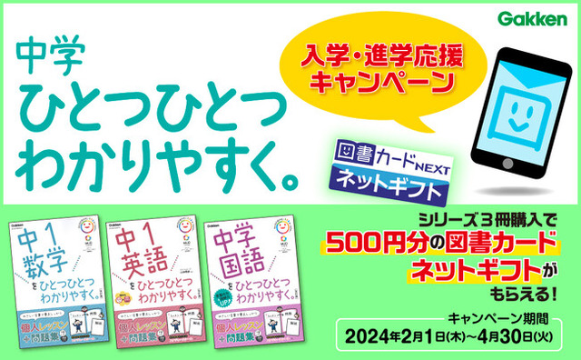 株式会社 学研ホールディングス(東京・品川/代表取締役社長:宮原博昭)のグループ会社、株式会社 Gakken(東京・品川/代表取締役社長:五郎丸徹)は、中学生向け学習参考書「中学ひとつひとつわかりやすく。」シリーズを3冊お買い上げいただいた方全員に、500円分の図書カードネットギフトをプレゼントするキャンペーンを、2024年2月1日(木)よりスタートいたしました。