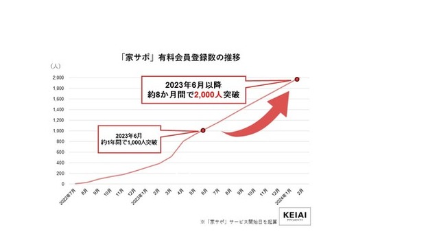 このように物価高騰が継続している状況の中、持ち家の定期点検、長期保証サービスの他に日々のメンテナンスや修繕コストにおいて、より安心して過ごしていただける「KEIAI家サポ」へのニーズが高まっています。会員登録の推移をみてもサービス開始の2022年7月から2023年6月までの1年間で会員数が1,000名を突破、その後2024年2月までの8か月間で有料会員登録者数が2,000名を突破しました。