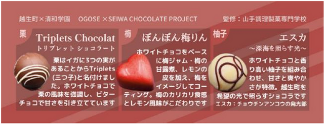 この度、マイスター・ハイスクール授業の一環で、今年のバレンタインデーにあわせて、清和学園高校調理科2年生の生徒が、越生町の名産を使って開発したオリジナルレシピに基づいてチョコレートを製造、2024年2月8日~14日に地場のデパート等で販売および生徒自ら店頭でPRを実施しました。