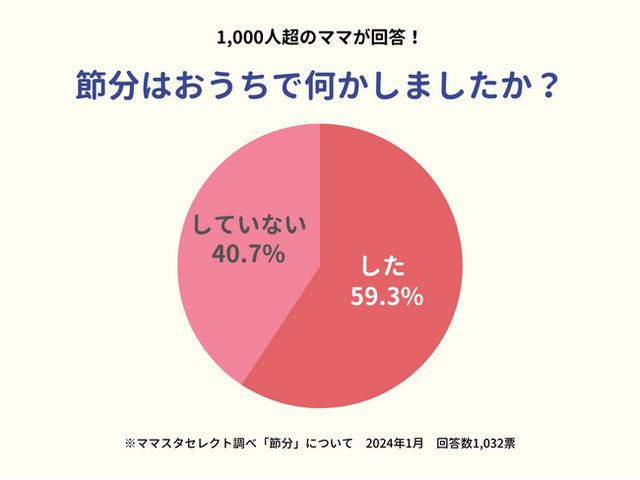 園や学校で節分行事がおこなわれることもあると思いますが、今回ママスタセレクトで実施したのは「家庭での節分の過ごし方」について。「節分はおうちで何かしましたか?」の設問に対し、「した」「していない」2つの解答を設定。1,000人を超える人たちから回答を得ることができました。