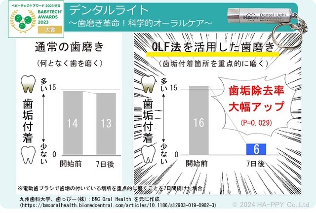 デンタルライトは、2023年11月21日、東京産業貿易センター浜松町館にて「BabyTech(R) Awards 2023 授賞式」で健康・毎日のお世話部門で大賞を受賞した製品です。