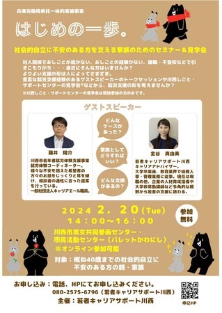 兵庫県労働局委託・川西市一体的実施事業として、豊富な就労支援経験のあるゲストスピーカーのトークセッションや川西しごと・サポートセンターの見学会などを通して、ひとりひとりに合ったより良い就労支援の形を考える「はじめの一歩。社会的自立に不安のある方を支える家族のためのセミナー&見学会」を開催する。