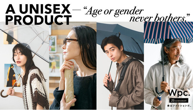 2024年にブランド創立20周年を迎えたWpc.は「傘は日用品ではなく、心躍らすアイテムとして"ファッション"ジャンルにステップアップしたい」という願いを込め、『傘はファッションだ。』というブランドメッセージを策定しました。傘とファッションを一人でも多くの方に楽しんでいただけるよう、ユニセックスプロダクトは年齢や性別を問わずお使いいただきやすい男女兼用のアイテムを新たにラインナップ。Wpc.が得意とするテキスタイルデザインや日常に馴染む無地デザインの傘・レインアイテムを幅広く展開します。