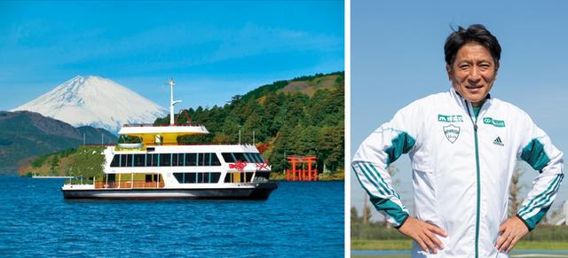 就航便船長として原晋監督が「箱根遊船 SORAKAZE」に乗船。原監督の出発の合図と、