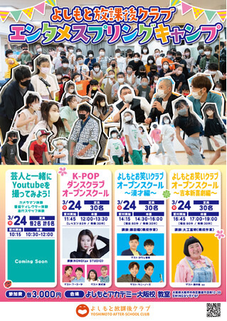 この度「よしもと放課後クラブ」では3/24(日)に、小中高生向けのエンタメ職業体験イベント『よしもと放課後クラブ エンタメスプリングキャンプ』を開催することが決定致しました。(実施場所:よしもとアカデミー大阪校)