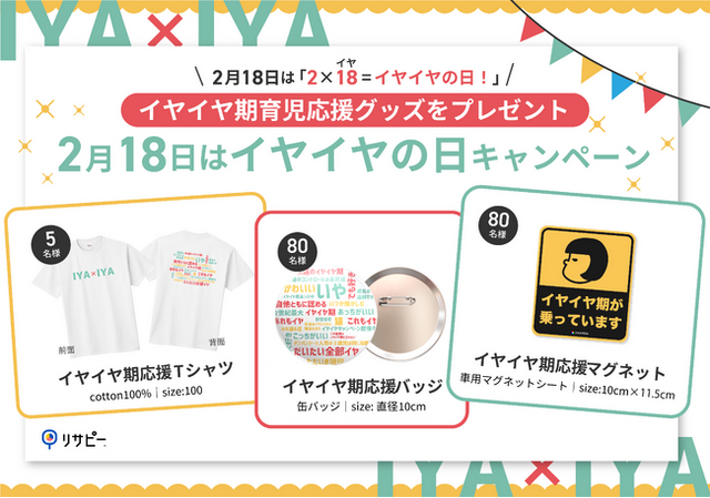 プロジェクトの始動に伴い、イヤイヤ期の子育ての苦労や喜びを共有し、励まし合いながら、前向きに、明るく、面白く乗り越えていきたい、働くパパママたちを応援したい、そんな想いから、イヤイヤ期を楽しく乗り切るための応援グッズをプレゼントする「2月18日はイヤイヤの日キャンペーン」を実施いたします。