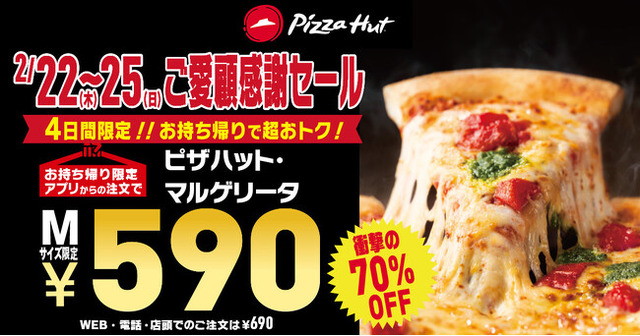 ピザハットの定番メニュー「ピザハット・マルゲリータ(Mサイズ・ハンドトス生地)」が、通常価格1,990円(税込、以下税込価格)のところ、お持ち帰りで690円に。さらに、ピザハット公式アプリ経由のご注文なら590円という衝撃の価格でご提供いたします。