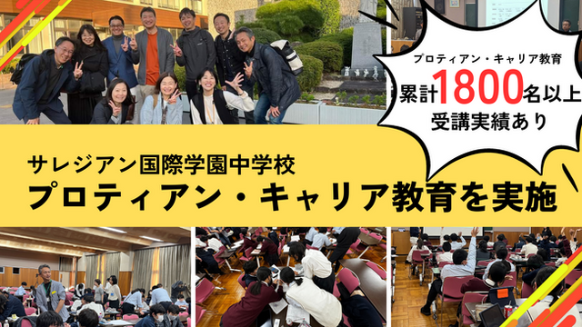 組織と個人のより良き関係性構築と個人の主体的なキャリア開発を支援する一般社団法人プロティアン・キャリア協会 (東京都新宿区、代表理事:田中研之輔・有山徹、以下、「当協会」)は、「現代版プロティアン・キャリア教育」授業を開発しています。2022年から始まり、約1800名以上の小・中・高・大学生に届けている自らの生き方・働き方をデザインする授業です。今回はサレジアン国際学園中学校の1年生約60名に向けて授業を実施しました。キャリア教育に力を入れているサレジアン国際学園中学校より「主体的な自己変革型キャリアを実際に歩んでいる方と交流する機会をつくりたい」とお声がけいただき、今回の実施となりました。