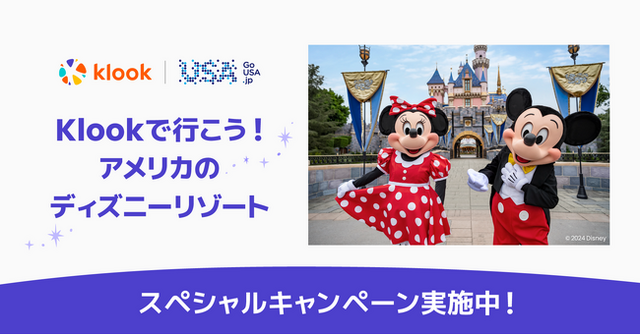 世界をリードする旅行・レジャー予約サイトKlookは、2月19日~9月30日の間、アメリカの2大ディズニーリゾート「カリフォルニア ディズニーランド・リゾート」と「フロリダ ウォルト・ディズニー・ワールド・リゾート」のパークチケット販売キャンペーンを実施します。本キャンペーンは、Klookと米国政府観光局のブランドUSAが協力して行います。円安で海外旅行をためらう方も多い中、日本のディズニーファンの方々に2024年こそアメリカのディズニーリゾートを楽しんでいただきたいという思いをこめて企画した、8ヶ月間に渡る特別長期キャンペーンです。特設サイトで、2名分のチケットを1名分の料金で購入可能なクーポンなどが当たるハズレなしのルーレットを開催する他、SNSキャンペーンなど様々な企画を展開します。