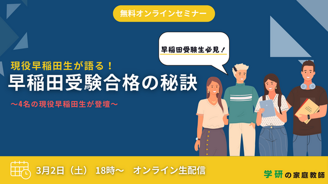 株式会社学研ホールディングス(東京・品川/代表取締役社長:宮原博昭)のグループ会社、株式会社学研エル・スタッフィング(東京・高田馬場/代表取締役社長:伊藤弘雅)は、【早稲田受験生 必見! 現役早大生が語る早稲田受験合格の秘訣セミナー】を3月2日(土)に開催いたします。