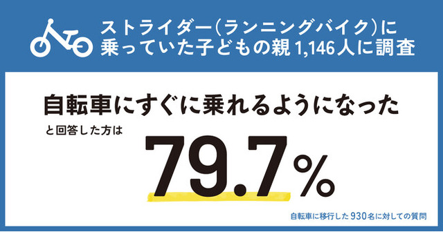 ストライダーから自転車に移行した約8割の方が、自転車にすぐ乗れるようになったと回答していることから、ストライダーに乗ってバランス感覚や体幹を身につけさえすれば、驚くほど簡単に自転車に乗れるようになるということがわかる結果となりました。