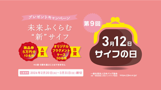 一般社団法人日本バッグ協会の主催により、3月12日の 『サイフの日』 を記念し、アンケートにご協力いただきました方の中から抽選で豪華賞品が当たるプレゼントキャンペーンを本年も開催しております!