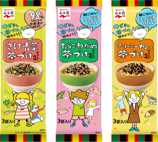 株式会社 永谷園(社長:成田 健一、東京都港区)は、忙しい朝でもお子さまがすすんで朝ごはんを食べてくれるお茶づけの素「さけ青菜茶づけ」「たらこわかめ茶づけ」「クリーミーカレー茶づけ」(税抜160円)を2024年2月26日(月)より新発売いたします。