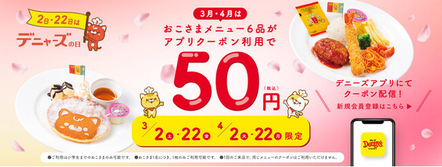 お客様よりキャンペーン継続の要望が多数ありました為、3月以降は毎月2・22日を「デニャーズの日」として、おこさまメニュー6品が50円となるキャンペーンを実施することとしました。