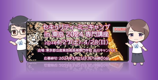 2024年4月27日(土)・28日(日)の2日間 現地開催にて東京都立産業技術高等専門学校、一般社団法人セキュリティ・キャンプ協議会、独立行政法人情報処理推進機構(IPA)が主催する「セキュリティ・ミニキャンプ in 東京 2024」の専門講座の学生参加者を募集いたします。