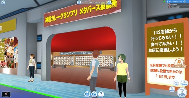 グランプリ決定戦は11月5日(日)、スタンプラリーは12月20日(水)に終了しましたが、3月9日(土)開催のマイスター会議まで時間があることもあり、御茶ノ水で開催されたグランプリ決定戦にも、スタンプラリーにも住んでいる地域が遠かったり、いろいろな事情から興味はあっても参加が叶わなかった方々のために、スタンプラリー参加店舗の142店の中から、「実際に行ってみたい!」「食べてみたい!」と思ったお店に、メタバース会場から応援投票ができる「神田カレーグランプリ メタバース応援投票所」を設置しました。