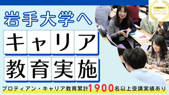 組織と個人のより良き関係性構築と個人の主体的なキャリア開発を支援する一般社団法人プロティアン・キャリア協会 (東京都新宿区、代表理事:田中研之輔・有山徹、以下、「当協会」)は、「現代版プロティアン・キャリア教育」授業を開発・提供しています。この授業は小中高校、大学への出前授業を実施してきた当協会メンバーによるキャリア教育プログラムです。このたびプロティアン・キャリア協会の認定者11名が、国立大学法人岩手大学で教養教育科目「キャリアを考える~プロティアンズがやってくる~(担当:喜多一美理事)」を実施しました。今回は当協会の教育ラボとプロティアン協会東日本支部との合同で実施いたしました。