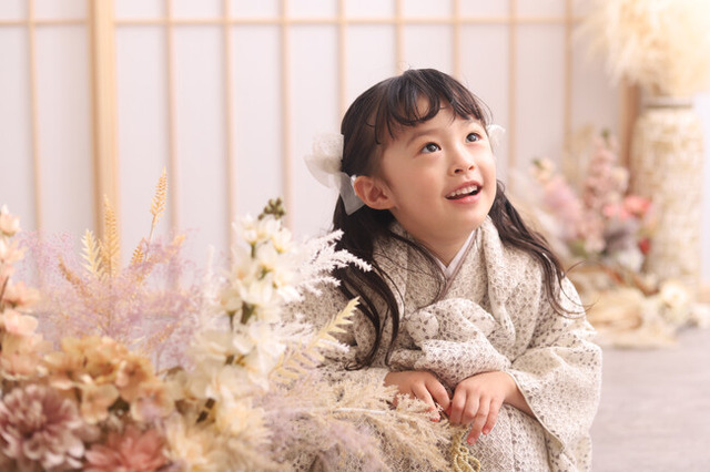 和室に柔らかい色合いの花を合わせ、子供らしいあどけなさと可愛らしさ、無邪気で自然な表情を撮影します。